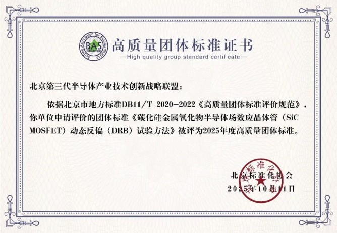第三代半導體產業技術創新戰略聯盟發布的T/CASAS 046—2024《碳化硅金屬氧化物半導體場效應晶體管(SiC MOSFET)動態反偏(DRB)試驗方法》團體標準,被評為2025年度高質量團體標準。